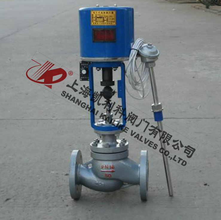 由单座调节阀、电动执行机构、温度传感器和温度调节器等部件组成,根据用户需要,分别有加热型与冷却型两种结构。加热型调节阀的结构与原理,工作前主阀芯处于半开位置,传感器处于自然状态。接上电源,主阀芯全开。介质由箭头方向流入主阀体、经阀芯对储热箱进行加热。当温度升到相应设定值时,传感器即产生相应线性信号输入一体化执行机构,随即驱动阀杆、阀芯产生位移,关闭主阀芯停止加热。当温度低于设定值时,传感器即产生线性信号输入一体化执行机构,驱使阀芯渐开,使介质按抛物线特性流入储热箱,进行加热直至设定值。这样被控介质始终在设定温度范围内被控制,从而达到控温目的。